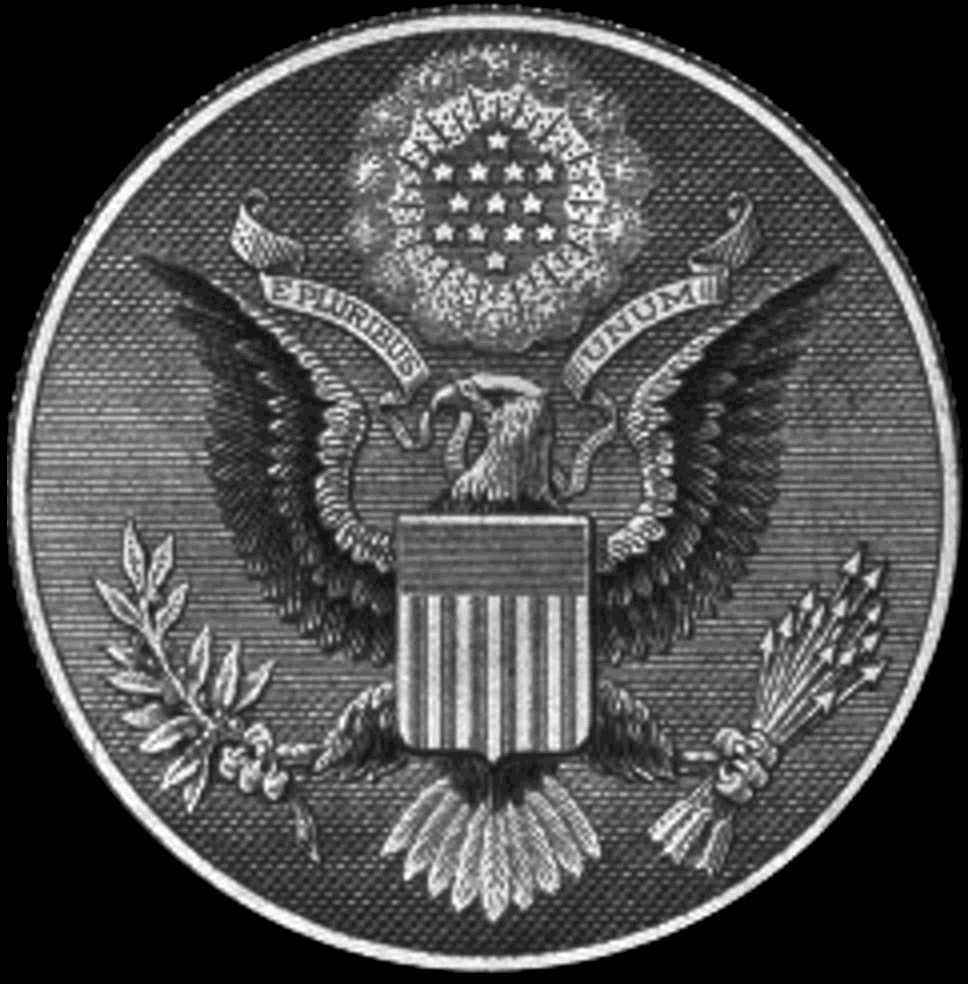 ...foi a figura alada impressa nos primeiros dólares, mas em 1841 foi substituída pela águia, um símbolo solar egípcio. Acima dela estão 13 estrelas correspondentes aos 13 estados de então. Essas estrelas, com as suas cinco pontas, são um símbolo maçônico. Ela tem 9 plumas na cauda, correspondendo aos graus do ritual maçônico de York. As asas exibem respectivamente 32 e 33 penas, aludindo assim aos graus do rito Escocês. Na pata esquerda segura 13 flechas, indicando acção e transmutação. No bico ela segura um pergaminho no qual em latim se lê "et pluribus unum", uma alusão à necessidade de integrar e agrupar os membros das antigas colônias que agora constituiam uma só nação. Fazer todas as nações uma só.