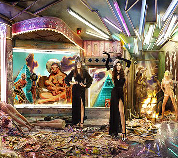 Kylie (esquerda) usa um cocar em forma de vulva fazendo-a parecer como uma espécie de sacerdotisa. As irmãs estão sobre uma pilha de revistas de "culto a celebridades", o lixo sobre o qual suas carreiras são construídas (Kanye retratado como Jesus na capa da Rolling Stones faz parte do mesmo). Por trás das irmãs (na base da pirâmide) está uma quase irônica caixa